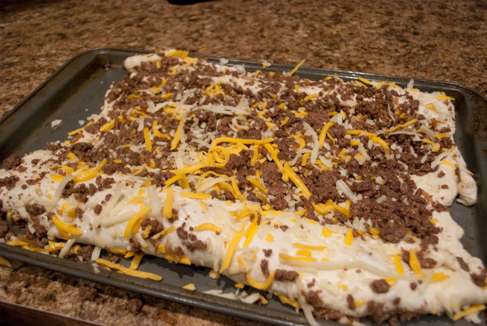- When the meat is browned, drain and pour evenly over the dough. Cover with cheese.